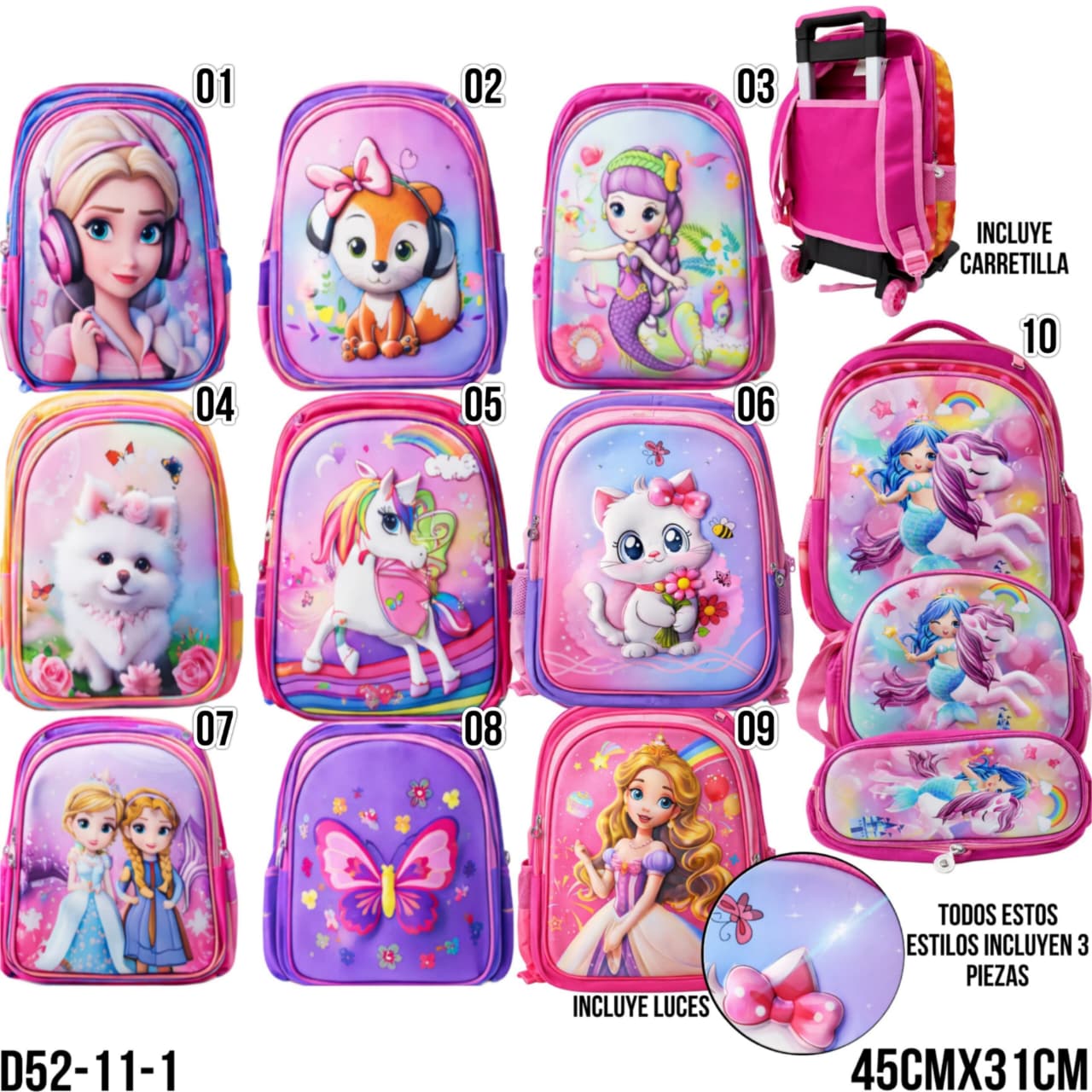 MOCHILA INFANTIL 3PZS C/LUZ/CARRETILLA -D52-11-1 cantidad